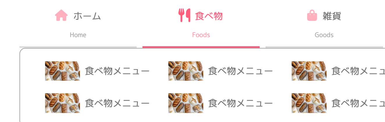 「食べ物」と「雑貨」メニューにはドロップダウンメニューが設定されており、以下の2タイプになっております。