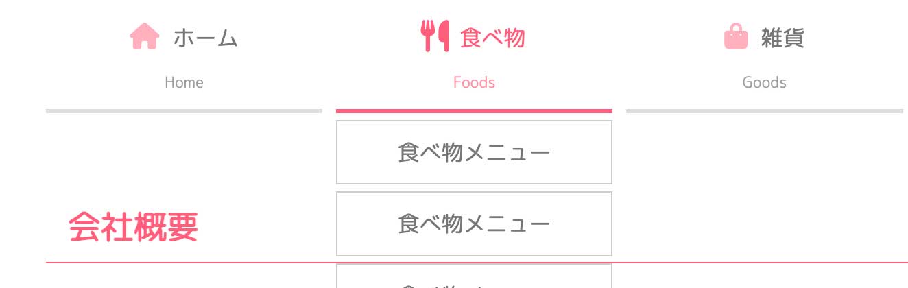 「食べ物」と「雑貨」メニューにはドロップダウンメニューが設定されており、以下の2タイプになっております。